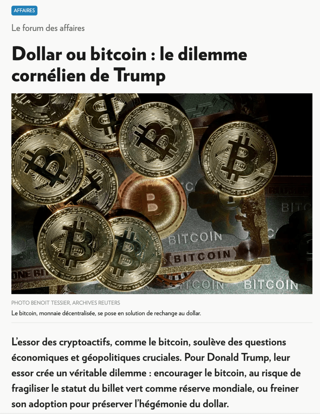 L’essor des cryptoactifs, comme le bitcoin, soulève des questions économiques et géopolitiques cruciales. Pour Donald Trump, leur essor crée un véritable dilemme : encourager le bitcoin, au risque de fragiliser le statut du billet vert comme réserve mondiale, ou freiner son adoption pour préserver l’hégémonie du dollar. Ce texte est un extrait d’une lettre d’opinion publiée