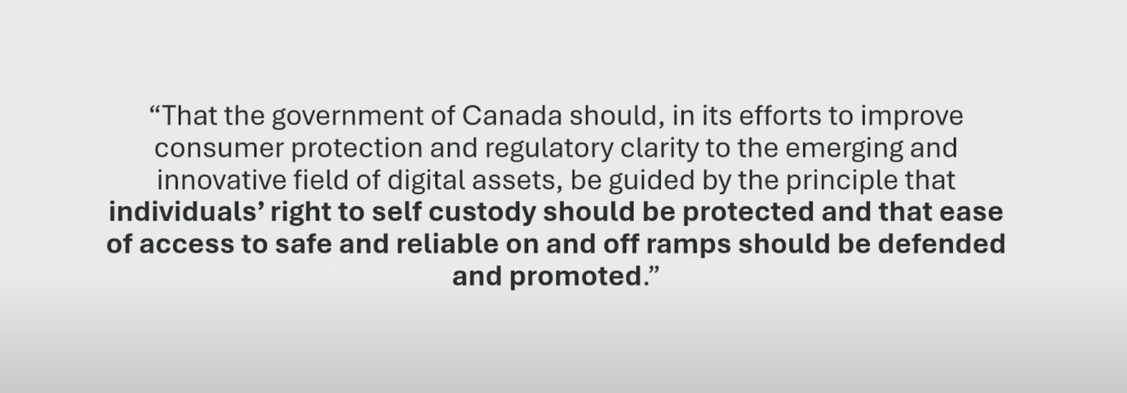 « The government of Canada should, in its efforts to improve consumer protection and regulatory clarity in the emerging and innovative field of digital assets, be guided by the principle that individuals’ right to self-custody should be protected, and that the ease of access to safe and reliable on and off ramps should be defended and promoted.«